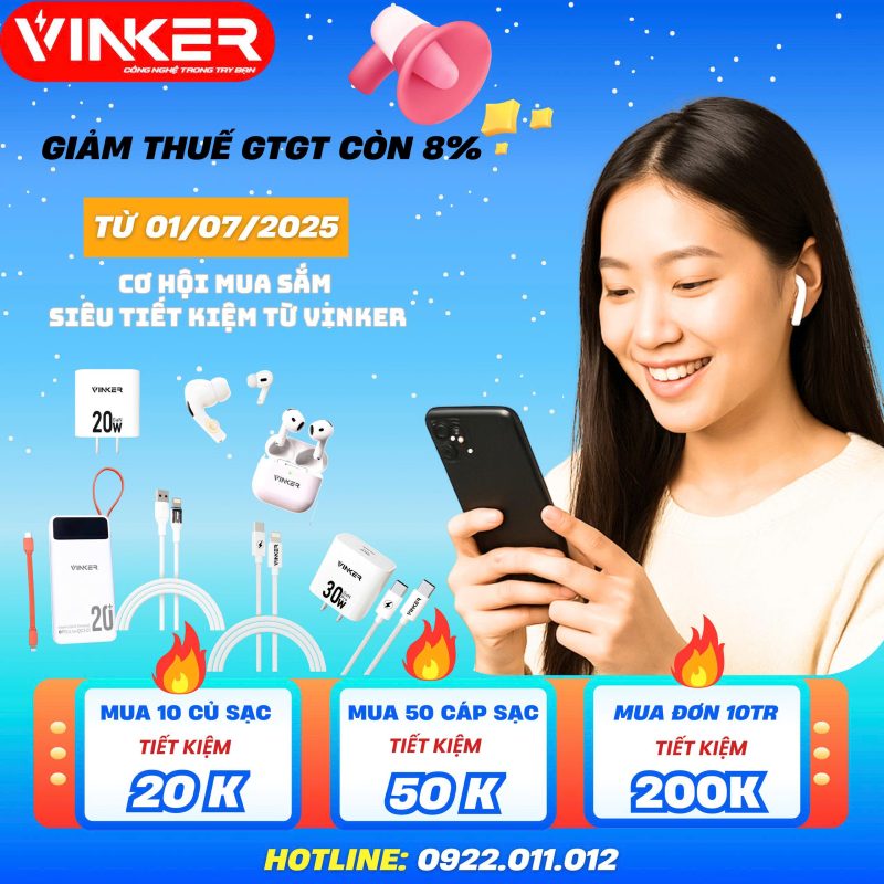 Từ ngày 01/7/2025, mức thuế GTGT cho nhiều mặt hàng tiêu dùng phổ biến – đặc biệt là đồ điện tử và phụ kiện điện thoại – sẽ giảm từ 10% xuống 8%. Đây là thay đổi ảnh hưởng trực tiếp đến túi tiền của người tiêu dùng, và cũng là cơ hội tuyệt vời để khách hàng VINKER mua sắm với mức giá tối ưu hơn bao giờ hết.