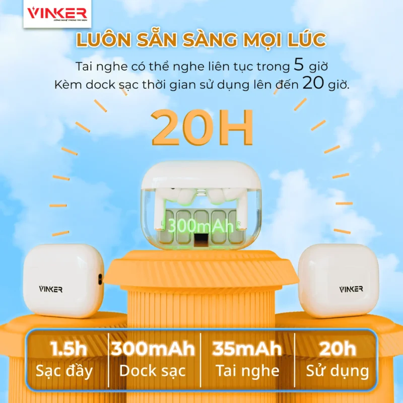 Dung lượng pin cao nghe với hộp sạc 20 giờ.